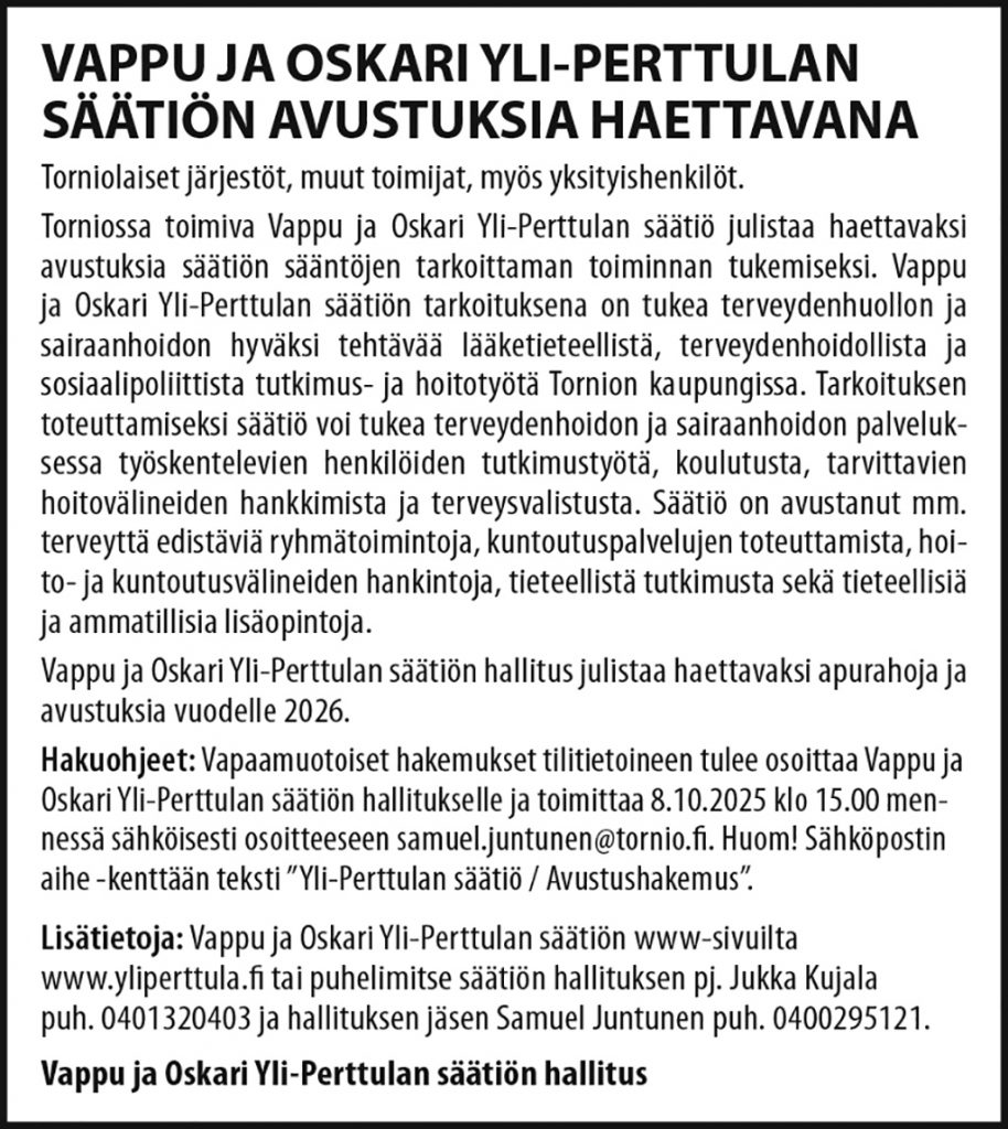 Torniosta kotoisin oleva, nyt jo edesmennyt, Vappu Yli-Perttula on v. 1997 perustanut Torniossa toimivan yleishyödyllisen Vappu ja Oskari Yli-Perttulan säätiön. Vappu Yliperttula on säätiön perustamisella halunnut tukea kotikaupunkinsa apua tarvitsevia. Vappu ja Oskari Yli-Perttulan säätiön tarkoituksena säätiön sääntöjen mukaan on tukea terveydenhuollon ja sairaanhoidon hyväksi tehtävää lääketieteellistä, terveydenhoidollista ja sosiaalipoliittista tutkimus- ja hoitotyötä Tornion kaupungissa. Tarkoituksen toteuttamiseksi säätiö voi tukea terveydenhoidon ja sairaanhoidon palveluksessa työskentelevien henkilöiden tutkimustyötä, koulutusta, tarvittavien hoitovälineiden hankkimista ja terveysvalistusta.